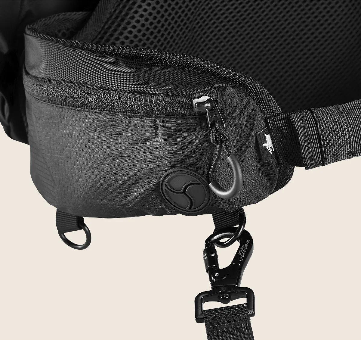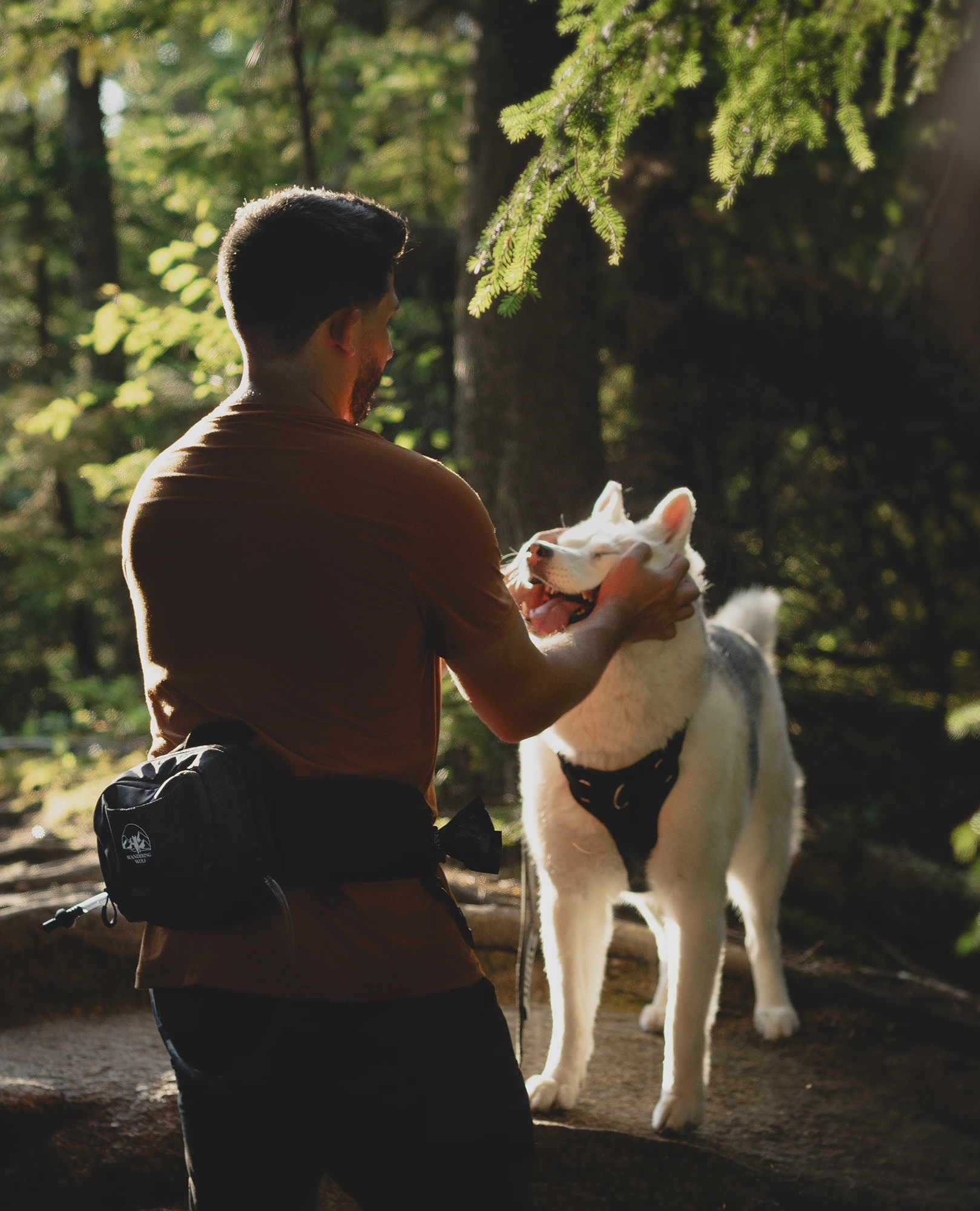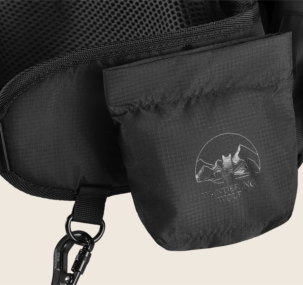 Each piece is built for seamless, hands-free exploration, with intuitive features like a dual water spout system, treat pouch, poop bag dispenser, odor-proof compartments, and a waist attachment for our wandering wolf bungee leashβso you can focus on the trail, not the logistics.