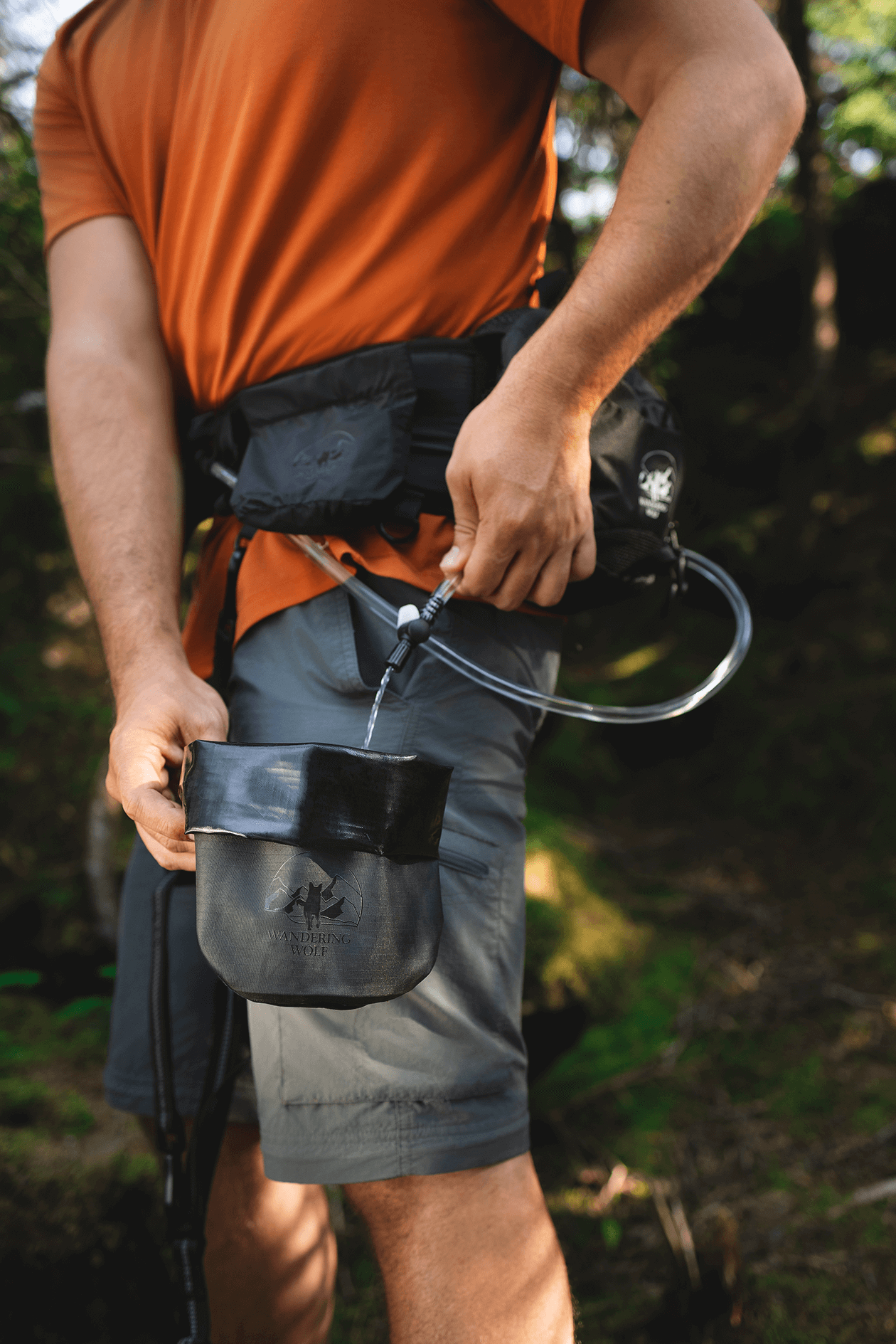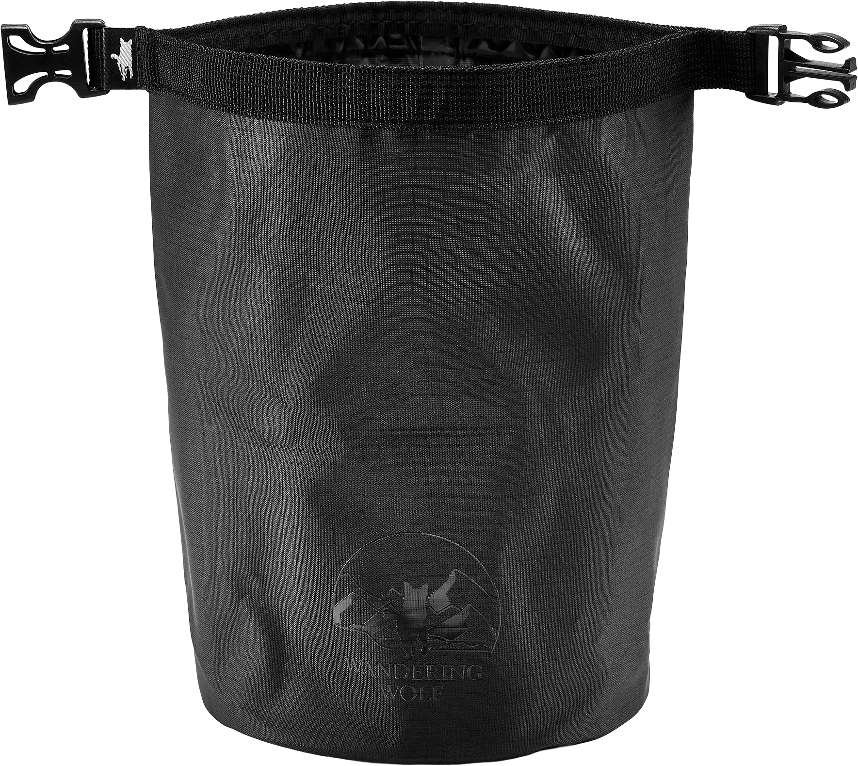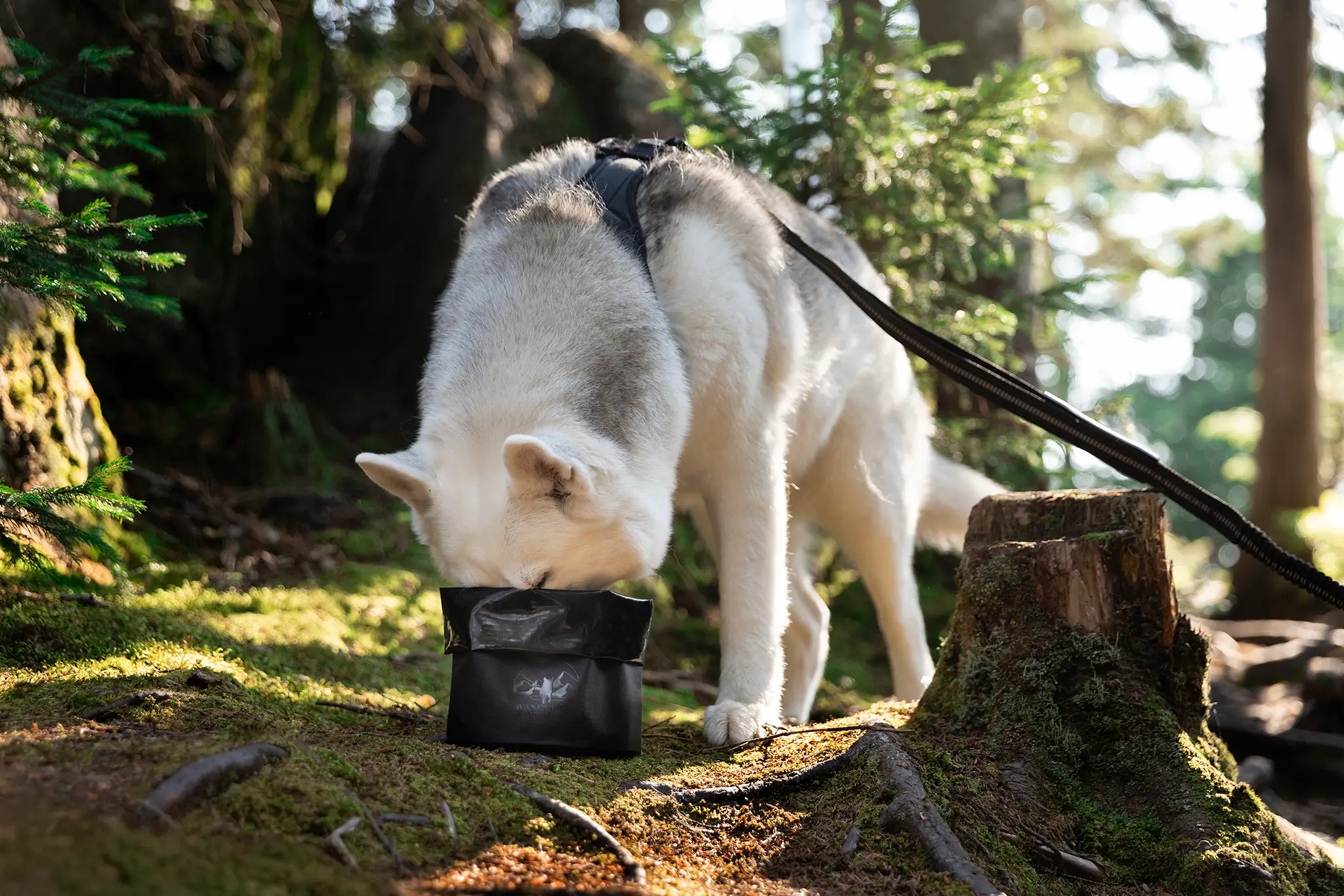 Crafted from FDA-approved, food-safe materials, this versatile bag keeps odors sealed while storing used poop bags on the trail. Its water-resistant design is easy to clean and quickly converts into a food or water bowl when rolled. Compact and portable, it clips securely to your Wandering Wolf backpack or fanny pack for hassle-free carrying.